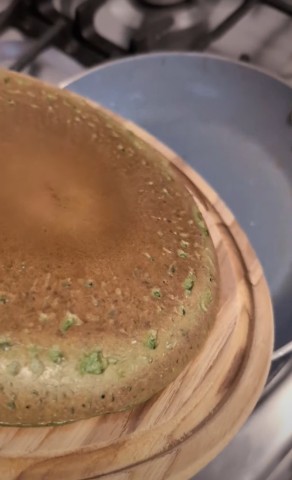 - Cocina por 8–10 minutos (controlando que cuaje sin quemarse). Para darle la vuelta, usa un plato o una tabla redonda, apoya el plato sobre la sartén, voltea, y desliza nuevamente la preparación a la sartén para cocinar del otro lado. Cocina 5–8 minutos más, hasta que esté bien cocido.